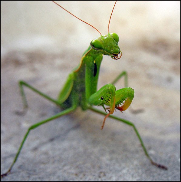 я впервые увидел, и снимал богомола.дело было на даче он сидел в старой раковине под навесом, после фотосесси выдал ему за "работу" последовательно 3-х колорадов (жуков) потратил на каждого не больше 5 минут от "еды" остались только панцыри. ПОЛЕЗНЫЙ ЗВЕРЬ!