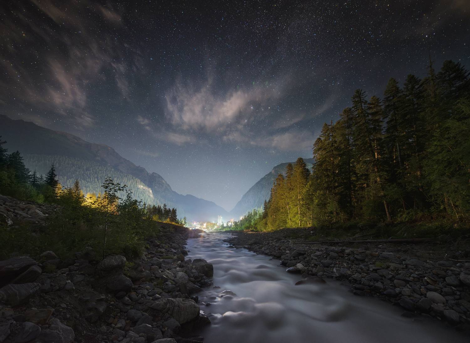 Серия кадров передаёт атмосферу ночного Домбая — безмолвие высокогорья, яркость звёздного неба и контраст между тьмой и светом. Каждый кадр — отдельный момент созерцания природы, где человек словно растворяется в пространстве Кавказа. Автором серии выступает Смольский Евгений, чьи работы фиксируют не только пейзаж, но и настроение высоты.