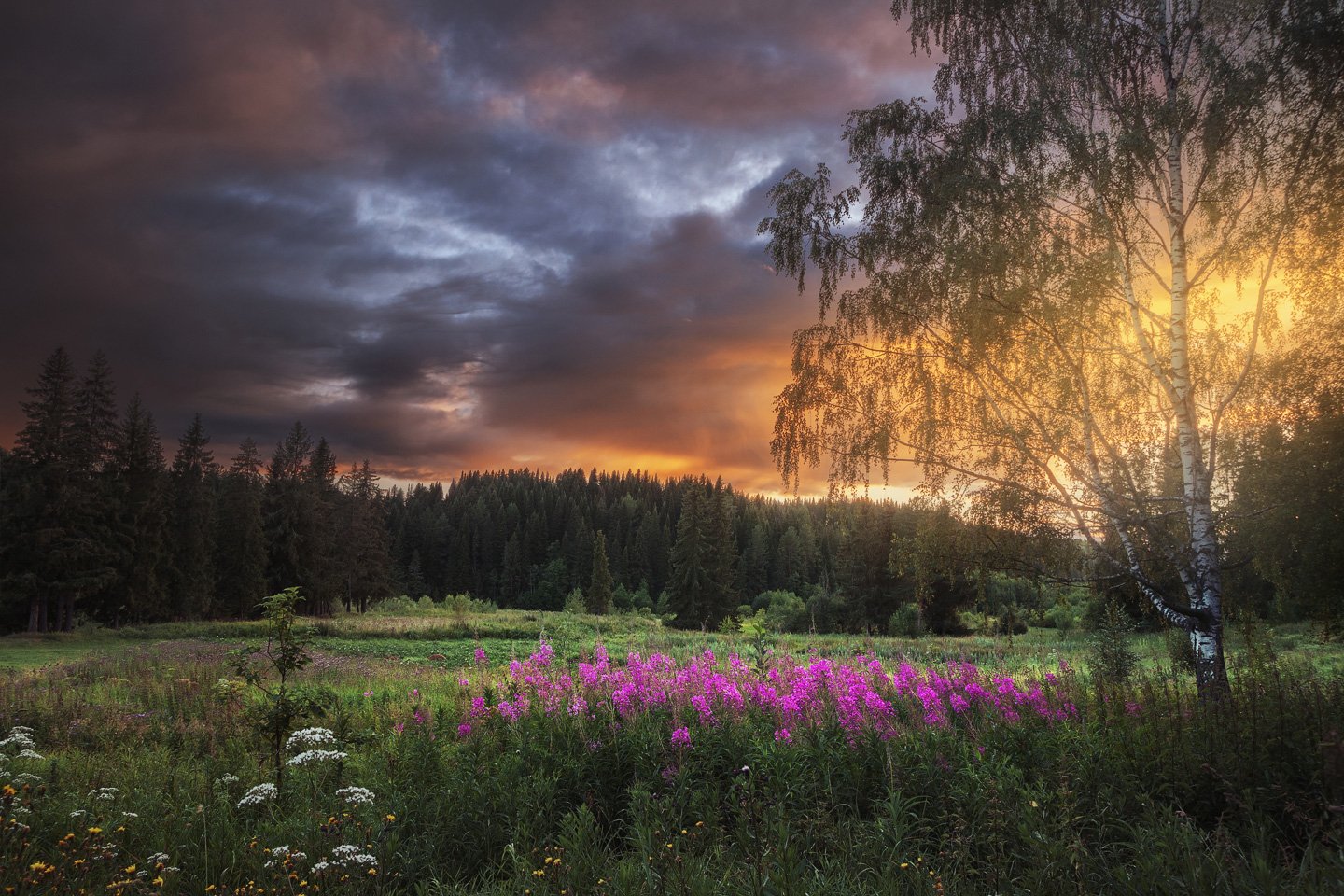 закат, поле, лето, кипрей, иван-чай, береза, Смольский Евгений