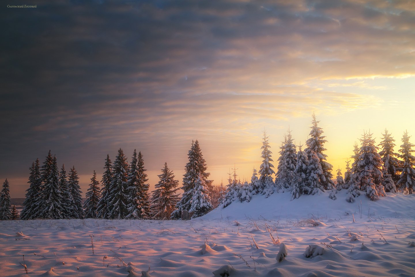 зима, закат, лес, холм, мороз, снег, вечер, ель, Смольский Евгений