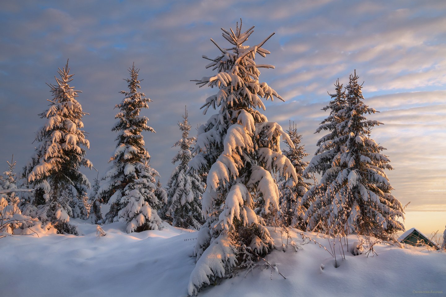 зима, закат, лес, холм, мороз, снег, вечер, ель, Смольский Евгений