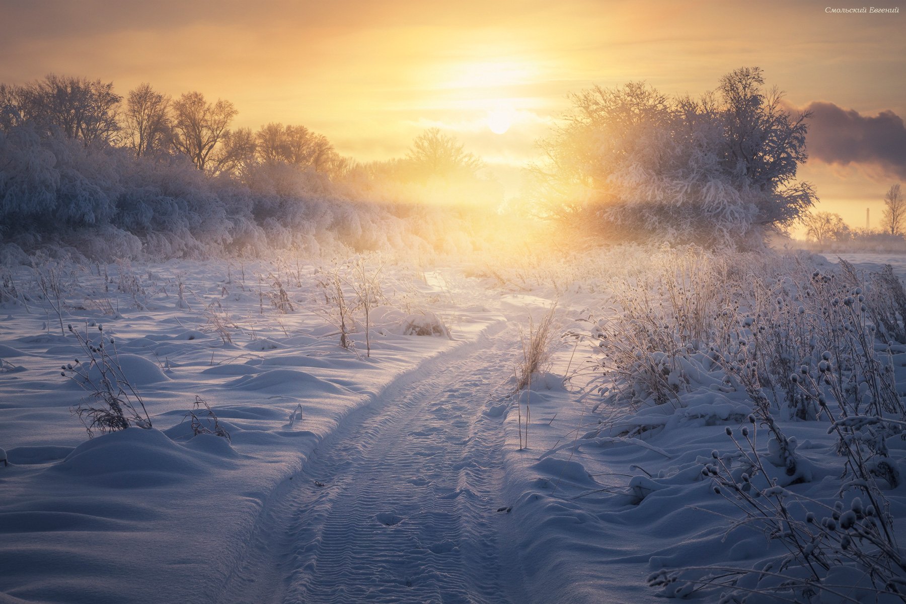 туман, зима, мороз, следы, снег, вечер, закат, Смольский Евгений