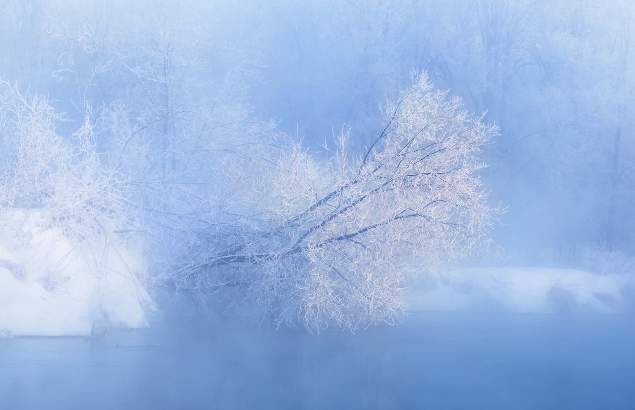 И так. подъем в 4.30, 5.30 уже в пути, 6.30 уже на берегу реки, идем к заранее найденной точке съемки. Как и предполагалось, над рекой густой туман, тишина и красота. Начал снимать, еще за долго до появления солнца у горизонта. Кстати, когда туман, солнце появляется не так резко как при ясной погоде, а плавно и постепенно, оно очень живописно окрашивает все вокруг. Первые кадры я делал, без него свет волшебный. Вся съемка велась около трех часов, за это вся камера покрылась толстым слоем льда, штатив был на столько холодным, что по не осторожности прикоснувшись к нему рукой, я взвыл от боли. Снимали на пару с другом Илья Максимов, то смеялись то по очереди выли, "Б...я как же пальцы от мороза ломит" ))) Но остановиться не получалось, это затягивает, как в сказке.