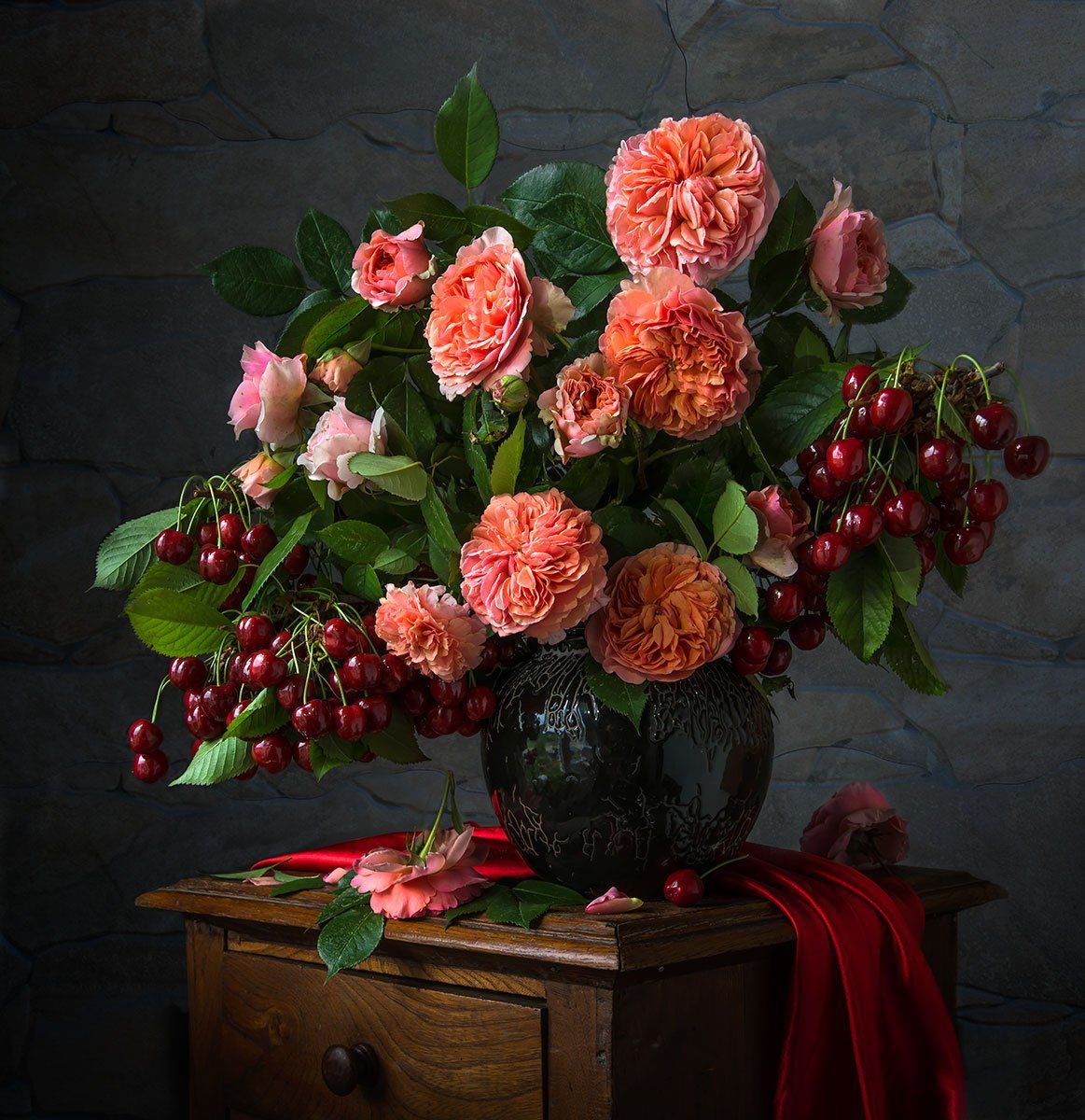красивый натюрморт с розами и черешней,художественное фото,искусство,садовые цветы., Людмила Костюченко