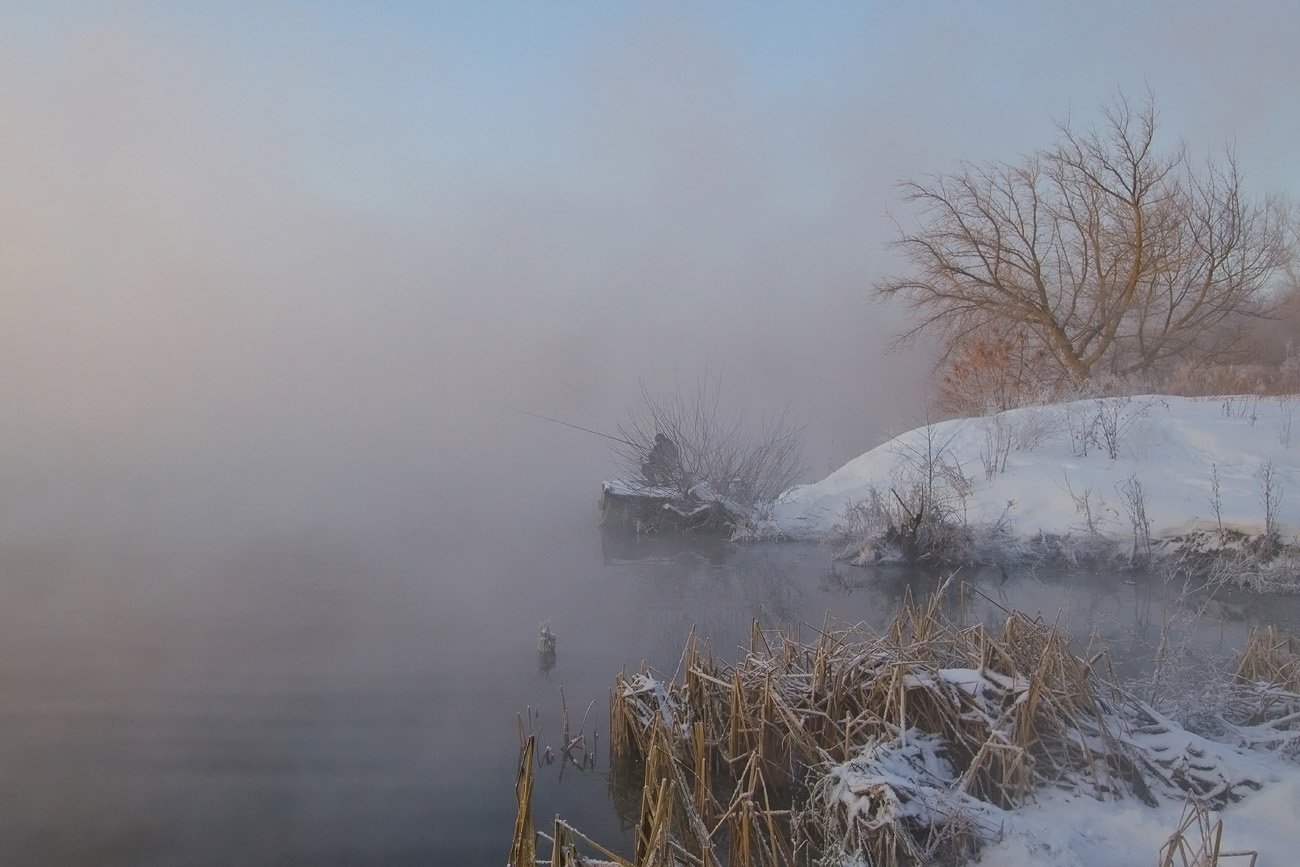 зима пейзаж озеро горячка рыбак, Михаил Агеев