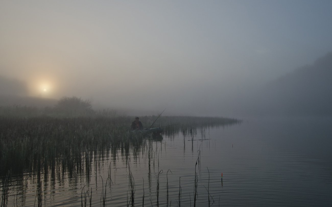 лето озеро новое утро туман рыбак, Михаил Агеев
