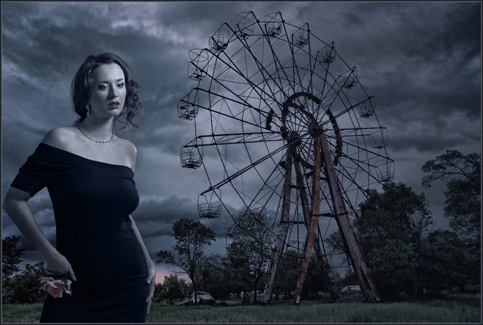 Свет на модели не соответствует пейзажа. Я бы сказала, что это модель на фоне плаката. Перспективы в пейзаже не вижу. Модель такая же резкая как и колесо, хотя находятся на разных уровнях в разных плоскостях. Сомневаюсь что на том пейзаже нет ветра совсем. Драматично, но в целую картину не складывается для меня. Извините, но мне не нравится эта фотография.