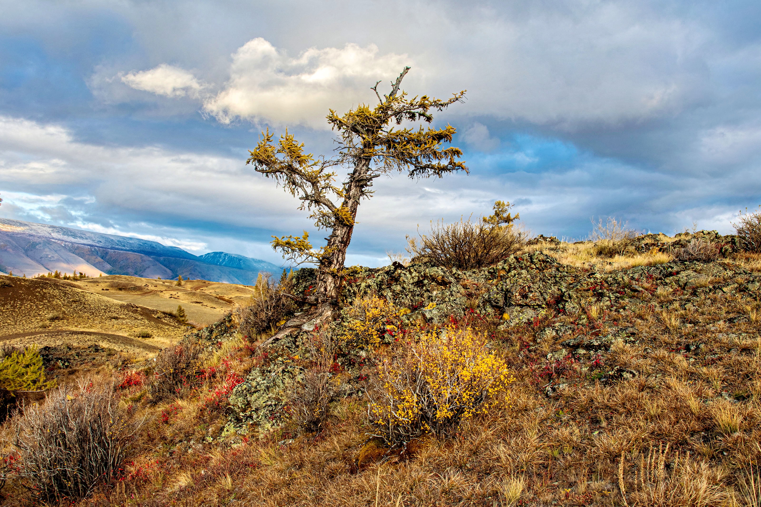 Тамара, снимок передаёт ощущение выносливости — как будто это дерево и земля вокруг просто *существуют*, несмотря на всё. Хорошо поймана осенняя палитра, особенно эти кусочки жёлтого и багряного в траве. Небо — сильный акцент, но чуть пересыщено, можно было чуть мягче. В целом — сильная композиция, чувствуется, что ты смотришь не просто на пейзаж, а на историю. 🌲📸