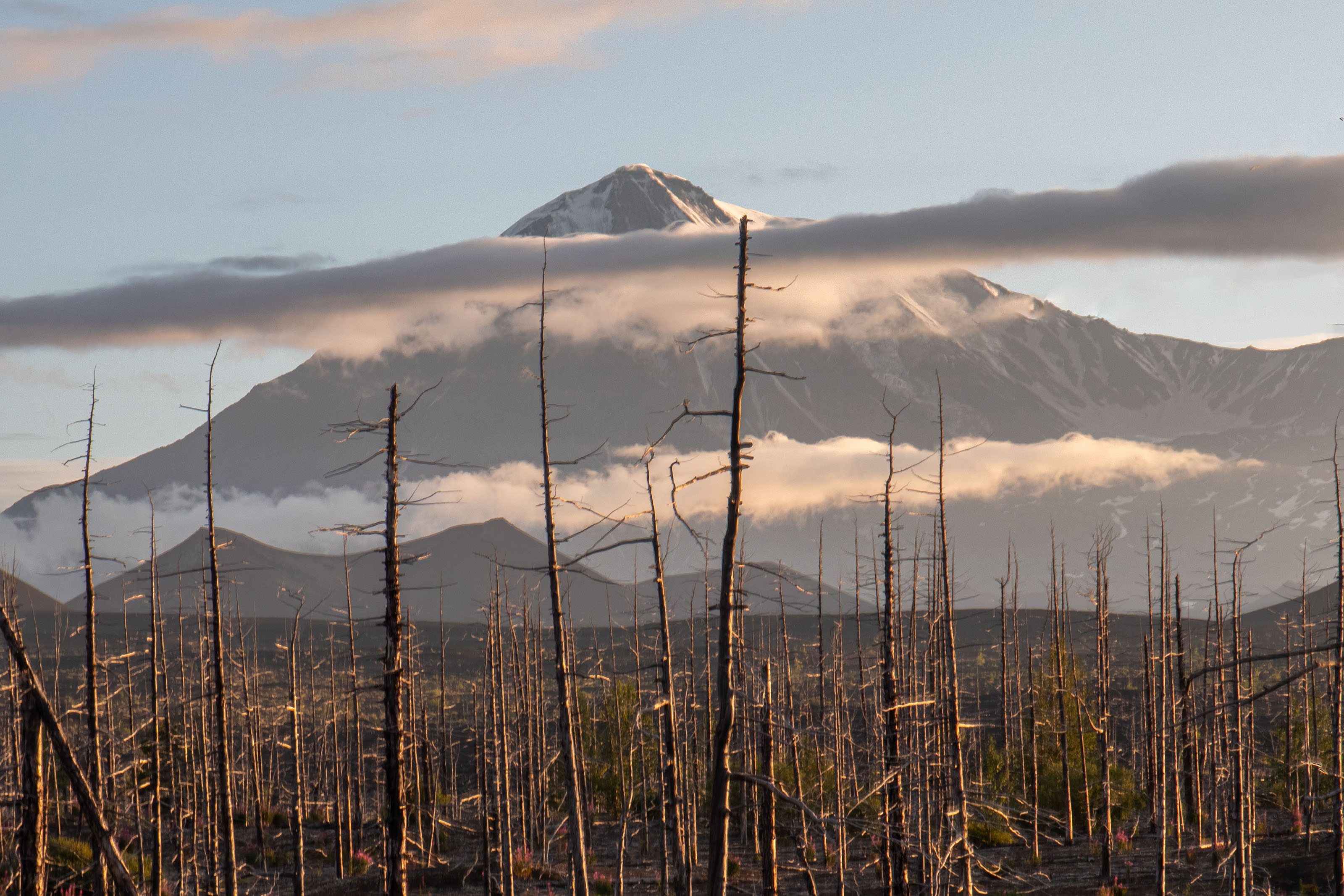 А мне как то не понравилось совсем. Сьёмка длиннофокусным телеобьективом испортила пейзаж Толбачика с мертвым лесом. И два продольных облачка и снятое почти в режимное не спасают кадр.