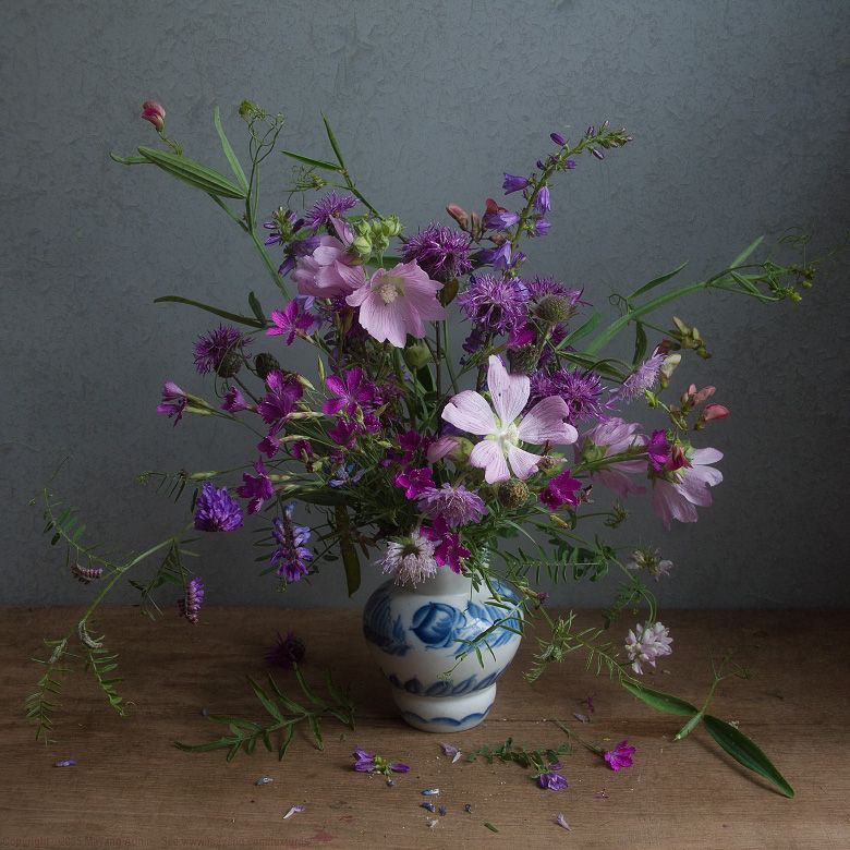 букет, сиреневые цветы, мальва, Елена Колеснева