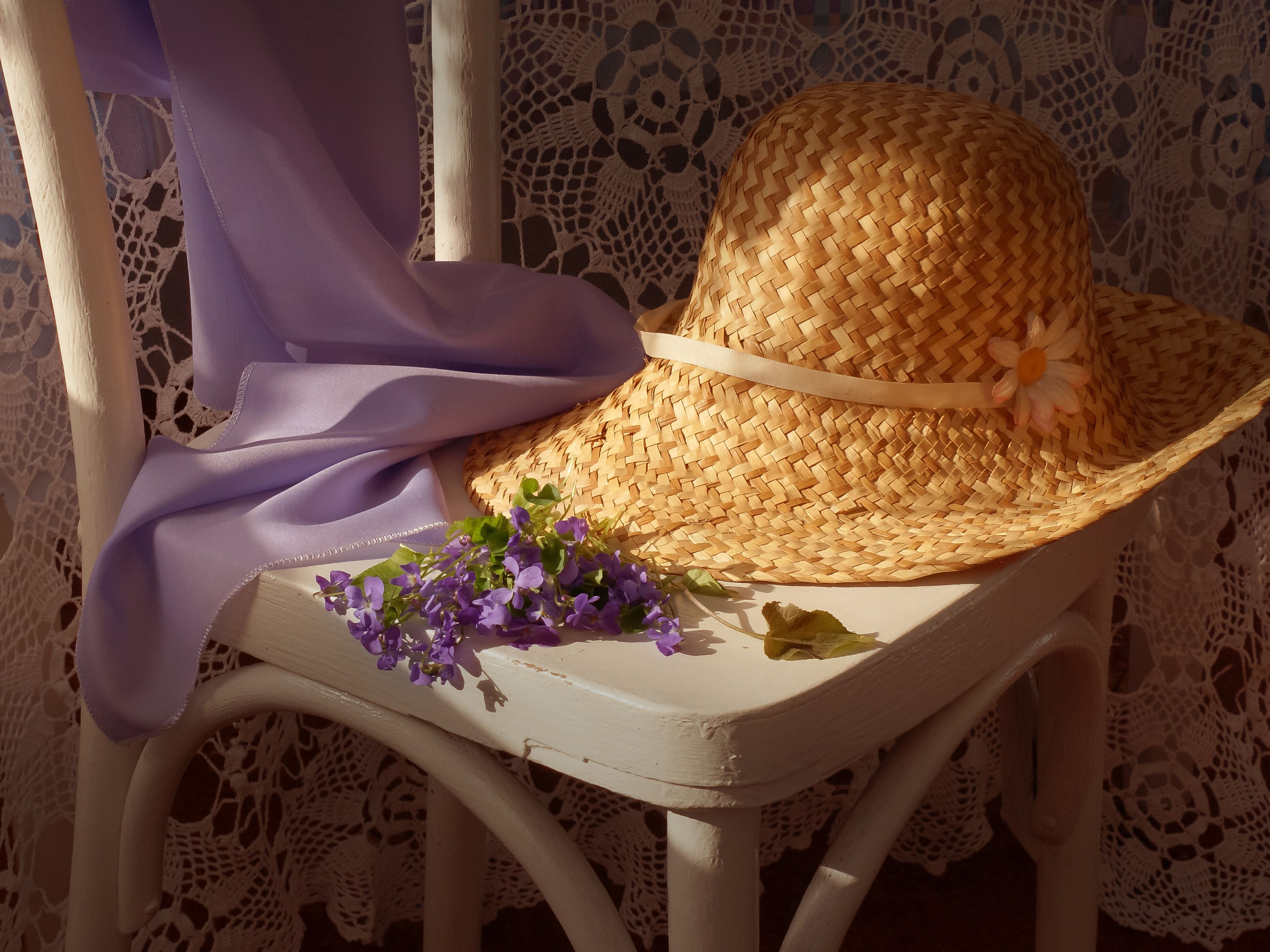 соломенная шляпа, дача, весна, фиалки, Колеснева Елена