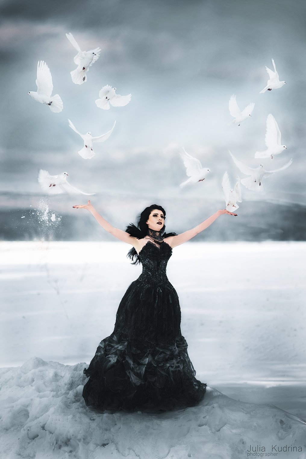голуби белые голуби птицы зима девушка черное платье сказка, Юлия Кудрина