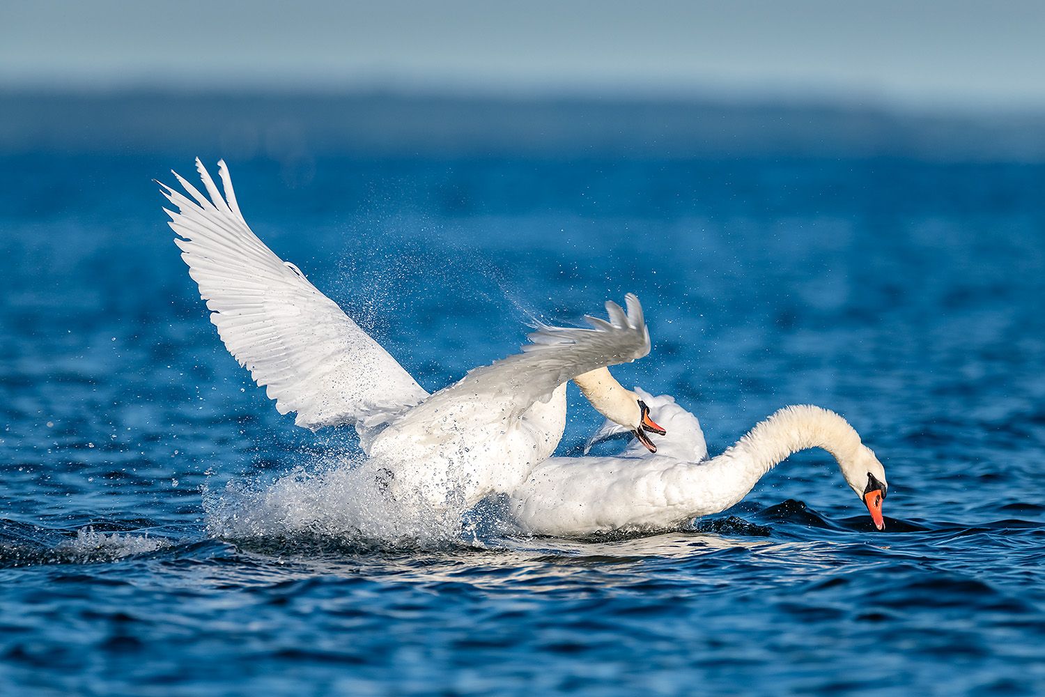 На фоне глубокого синего моря лебедь вступает в ожесточённый конфликт — его крылья развернуты, тело наклонено в атаку, вода взрывается брызгами. Это не просто птичий спор, а драматическая сцена борьбы за пространство, где природа раскрывает свою неожиданную жестокость. Фотография захватывает мгновение, когда спокойствие нарушается, и мир природы обнажает свою истинную суть — борьбу за выживание.