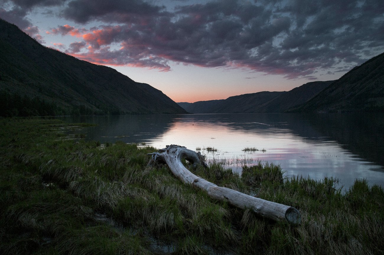 Озеро Кара-Холь, которое находится в Природном биосферном заповеднике «Убсунурская котловина», довольно сложно сфотографировать. Оно вытянуто с севера на юг и закрыто с запада и с востока довольно высокими горами. Вот и получается, что солнце сюда попадает, когда уже свет очень жесткий. И вот на закате, когда уже солнце ушло за горизонт, вдруг подсветились облака.