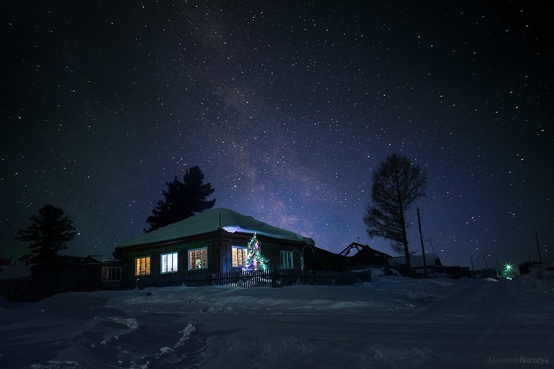 Приехав к родителям на праздничные каникулы, мы с моим закадычным другом Максом (http://www.photosight.ru/users/441260) решили прогуляться по окрестностям. Нашли украшенный домик и даже чрезмерное внимание старушки, интересовавшейся, что же мы снимаем, не помешало нам. Конечно же в оригинале звезд не было видно, небо я взял из своего же кадра с летней поездки в Ергаки, надеюсь это не не очень помешает восприятию.