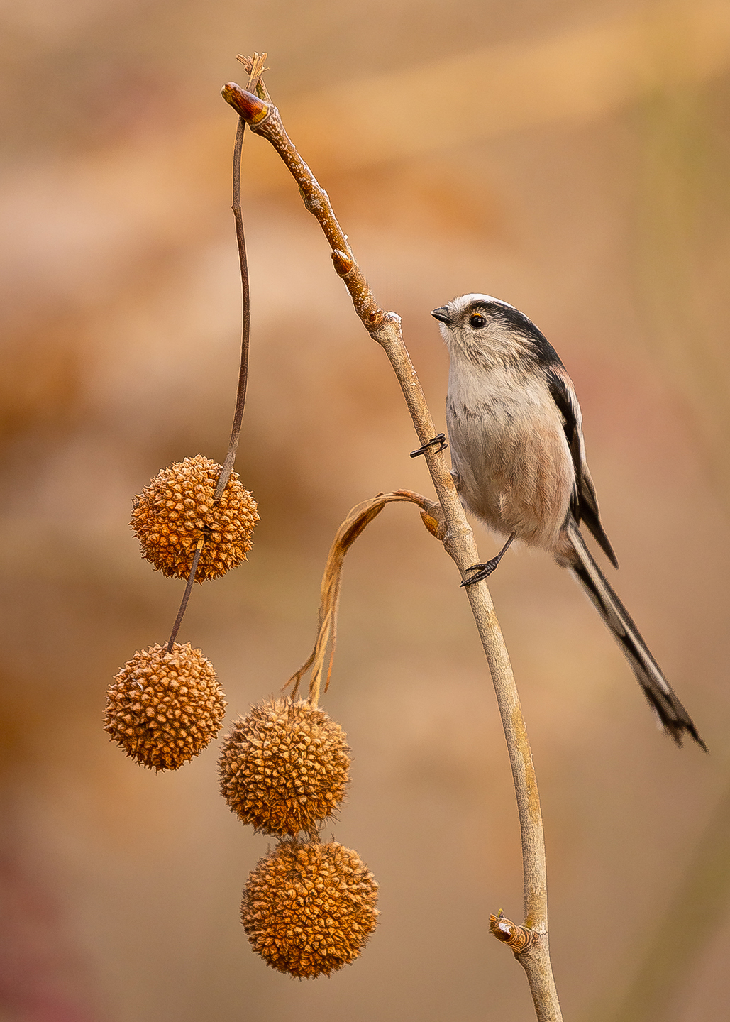 A small bird perches lightly on a bare branch, beside four round, spiky seed pods. The soft light warms the scene, and the bird’s long tail hangs down like a quiet line. Simple. Still. Alive.