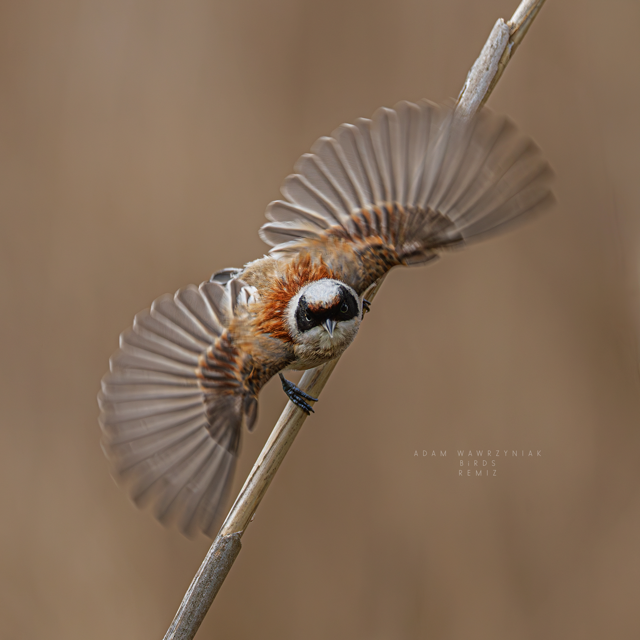 На снимке запечатлён краткий миг, когда птица, удерживаясь на тонкой ветке, готовится к взлёту. Крылья раскрыты, перья слегка размыты — эффект движения зафиксирован с высокой точностью. Тёплый, однородный фон подчёркивает изящество птицы, акцентируя внимание на её позе и деталях оперения. Фотография передаёт напряжение и грацию природного момента, застывшего в кадре. Работа Адама Ваврыниака демонстрирует мастерство макросъёмки и умение захватывать мгновения, которые обычно остаются незамеченными.
