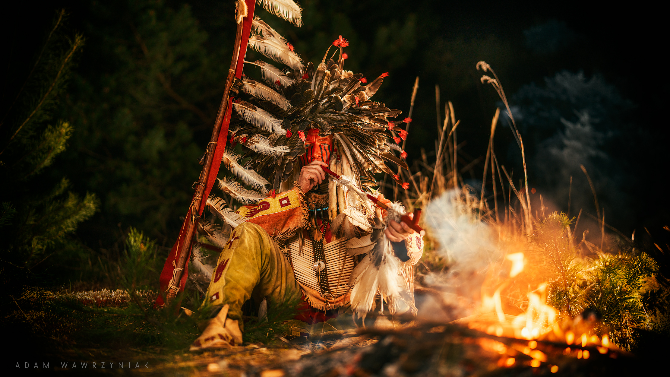 The contrast between the warm firelight and deep shadows works well here. The textures of the feathers and fabric are distinct, though the smoke adds a bit of haze to the mid-ground. Solid composition with good focus on the subject. 📸