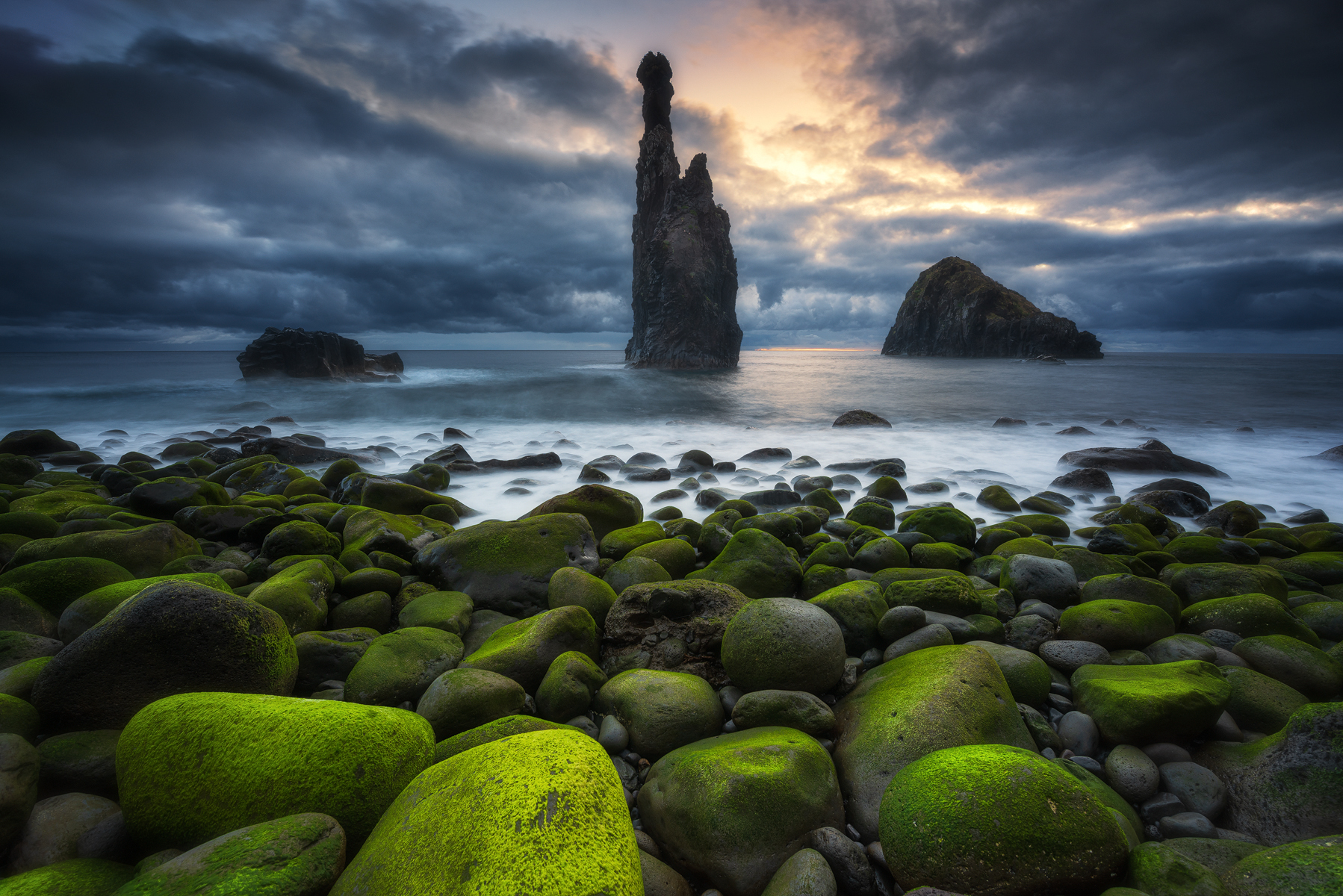 На переднем плане — гладкие, покрытые мхом камни, уходящие в спокойную воду. Вдали — высокая изолированная скала, возвышающаяся над морем под тяжёлыми облаками. Свет рассвета пробивается сквозь тучи, создавая контраст между тьмой и светом. Композиция передаёт ощущение одиночества и величия природы. Фотография отражает гармонию и силу природных элементов.