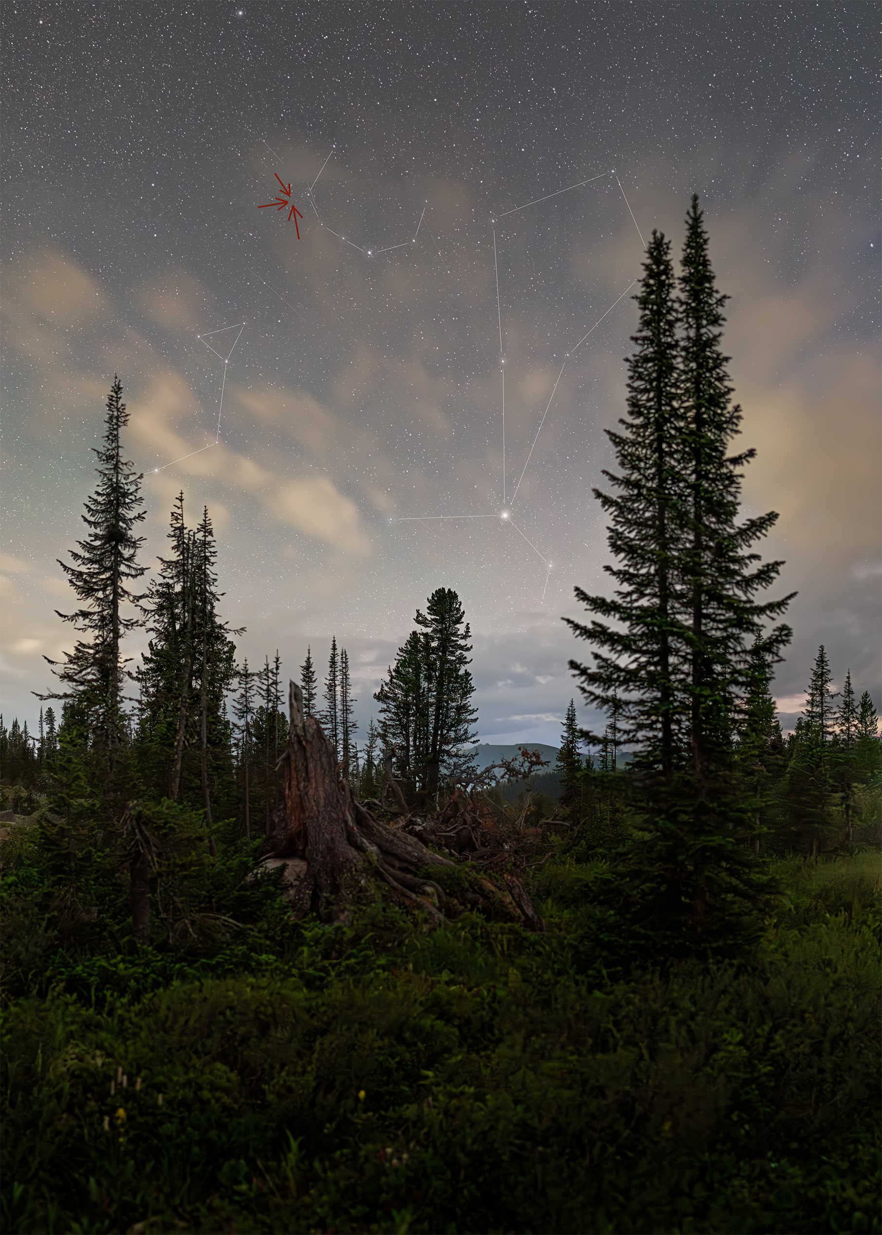 ... да и чего уж кривить душой, в момент съемки и меня они не особо интересовали... Главным героем должен был стать пень-богатырь... но опытный глаз, да и неопытный тоже, сразу видит, что пошло не так (да-да, очень стыдно, детская ошибка). Но, справедливости ради, Северная Корона и Волопас (еще часть Змеи затесалась) - и правда симпатичные и относительно легко идентифицируемые на небе, особенно Северная Корона, от которой, кстати уже третий год ждут вспышки \"полыхающей звезды\". Никакого особого зрелища там, правда, не предвидится, просто звезду, которую обычно невооруженным глазом не видно, станет видно на пару-тройку дней. Куда смотреть, если вдруг хотите поймать момент, примерно подскажет третья версия