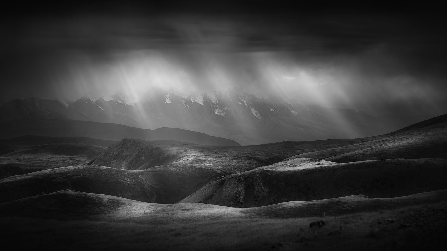 Обнадёживающий вид солнечных лучей во время затянувшейся непогоды. Вид на Северо-Чуйский хребет с гряды гор тянущихся вдоль реки Аккая. Республика Алтай.