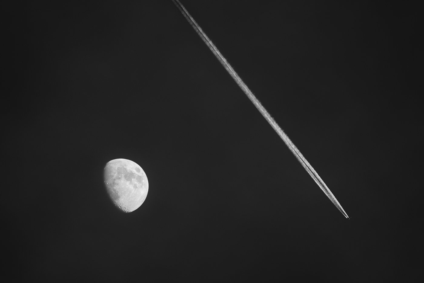 Да не особенно и быстро. Снимал луну крупно в сумерках, когда она оптимальна по яркости. Тут самолет пролетел (они часто над городом летают). Снял и его. В общем, то случайный кадр.