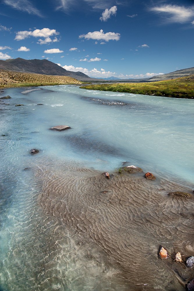 В горах Алтая довольно много известковых пород которые во второй половине лета активно вымываются реками, благодаря чему реки приобретают характерный белёсый оттенок. Река Талдура. Горный Алтай.