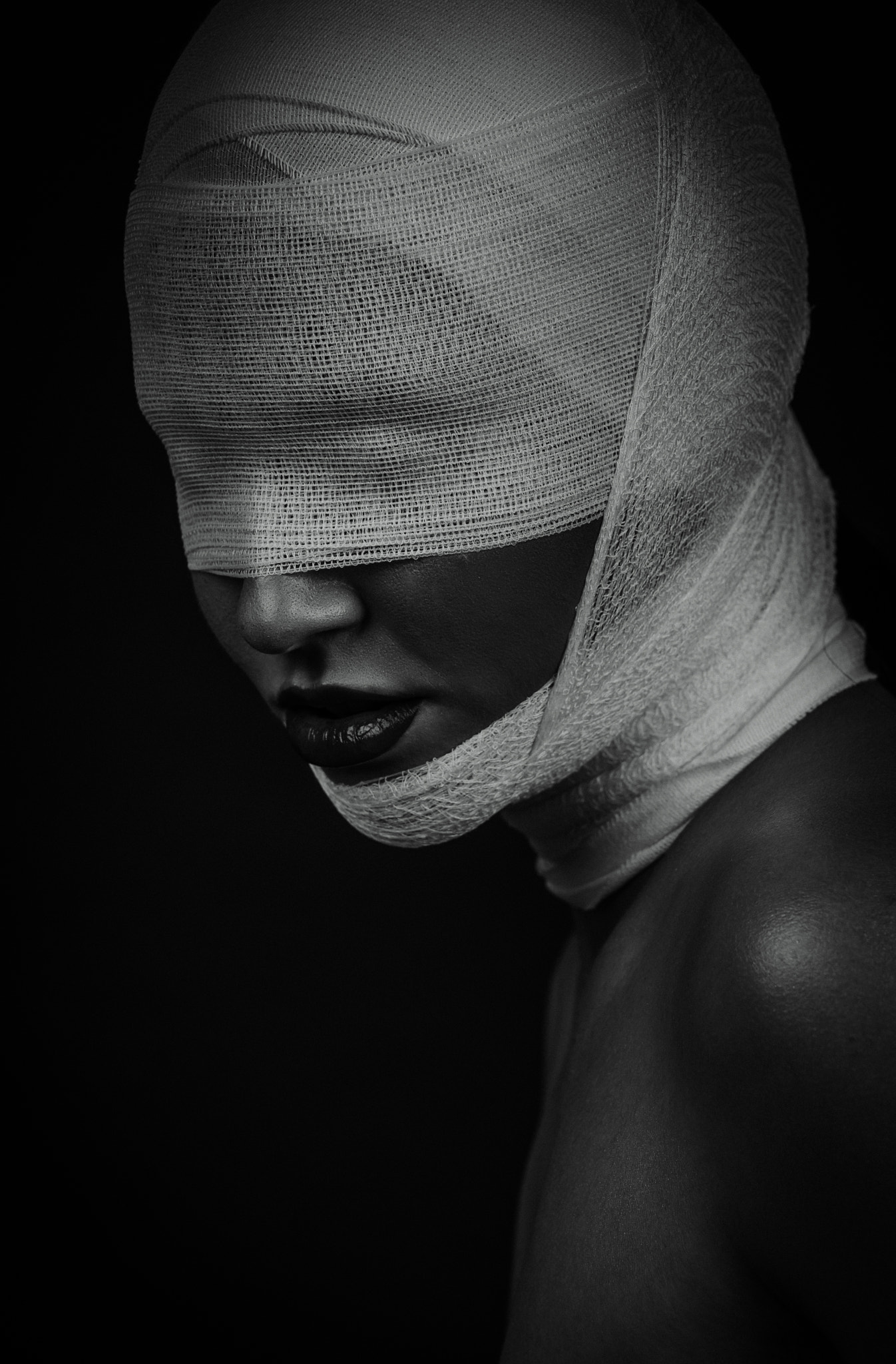 Strong contrast, tight framing. The bandage creates texture and mystery, the low light emphasizes form.