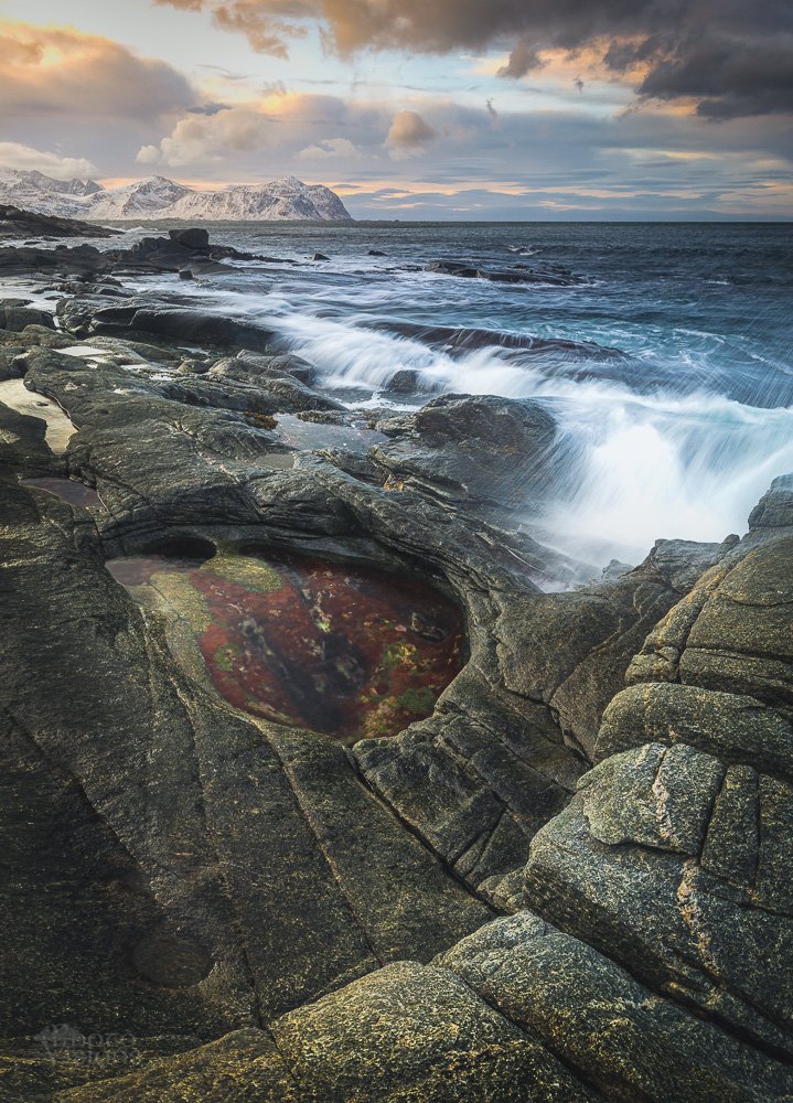 Rock motive by the sea shores, Lofoten Islands, Norway, wintertime, January 2020.