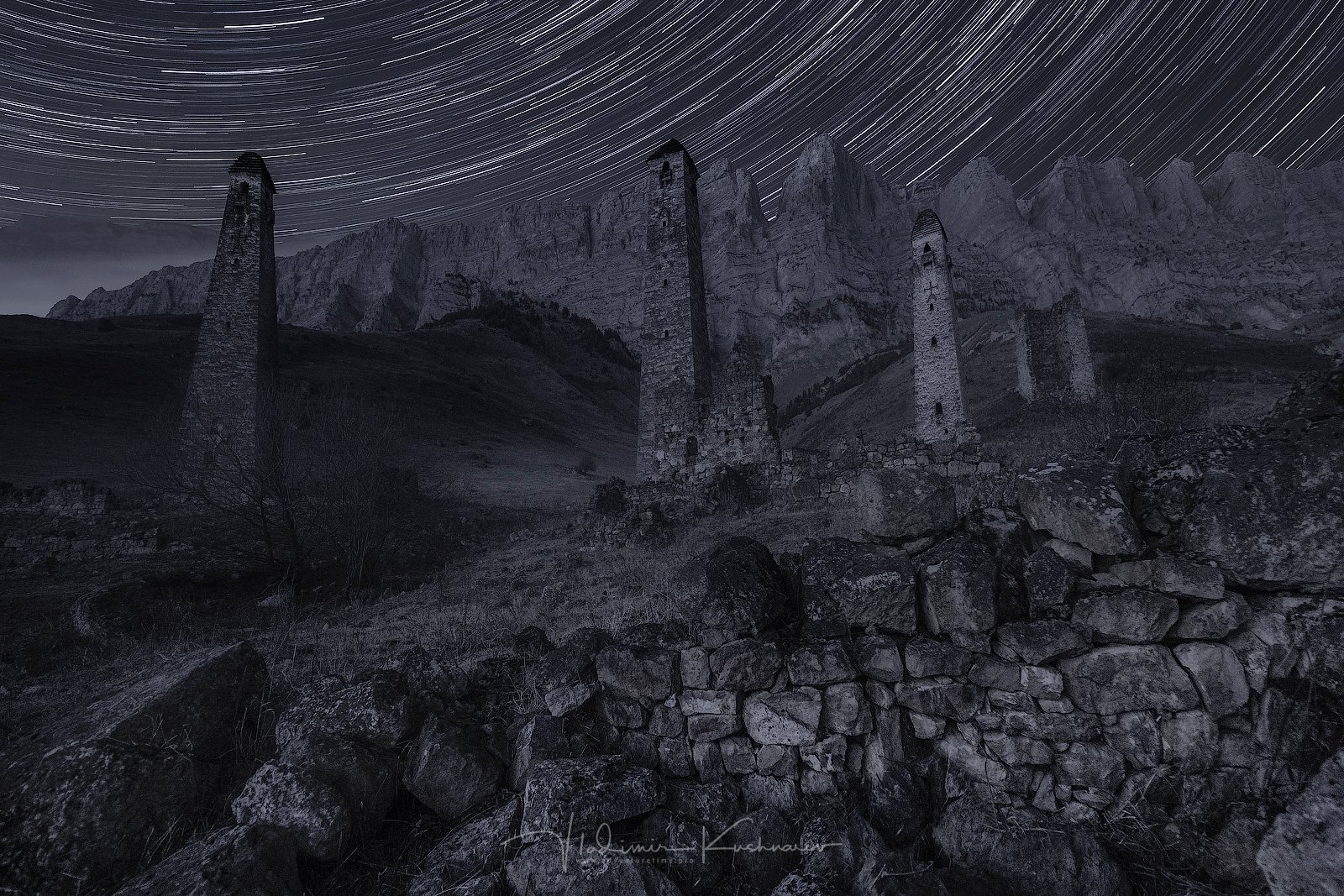 Ну и, конечно, у нас были ночные съемки в Ингушетии, куда ж без них... Было правда жутковато снимать на этой локации, в кромешной темноте, когда то тут, то там, под ногами, в свете налобного фонаря, виднелись остатки и "запчасти" копытных, ставших добычей неведомых хищников.