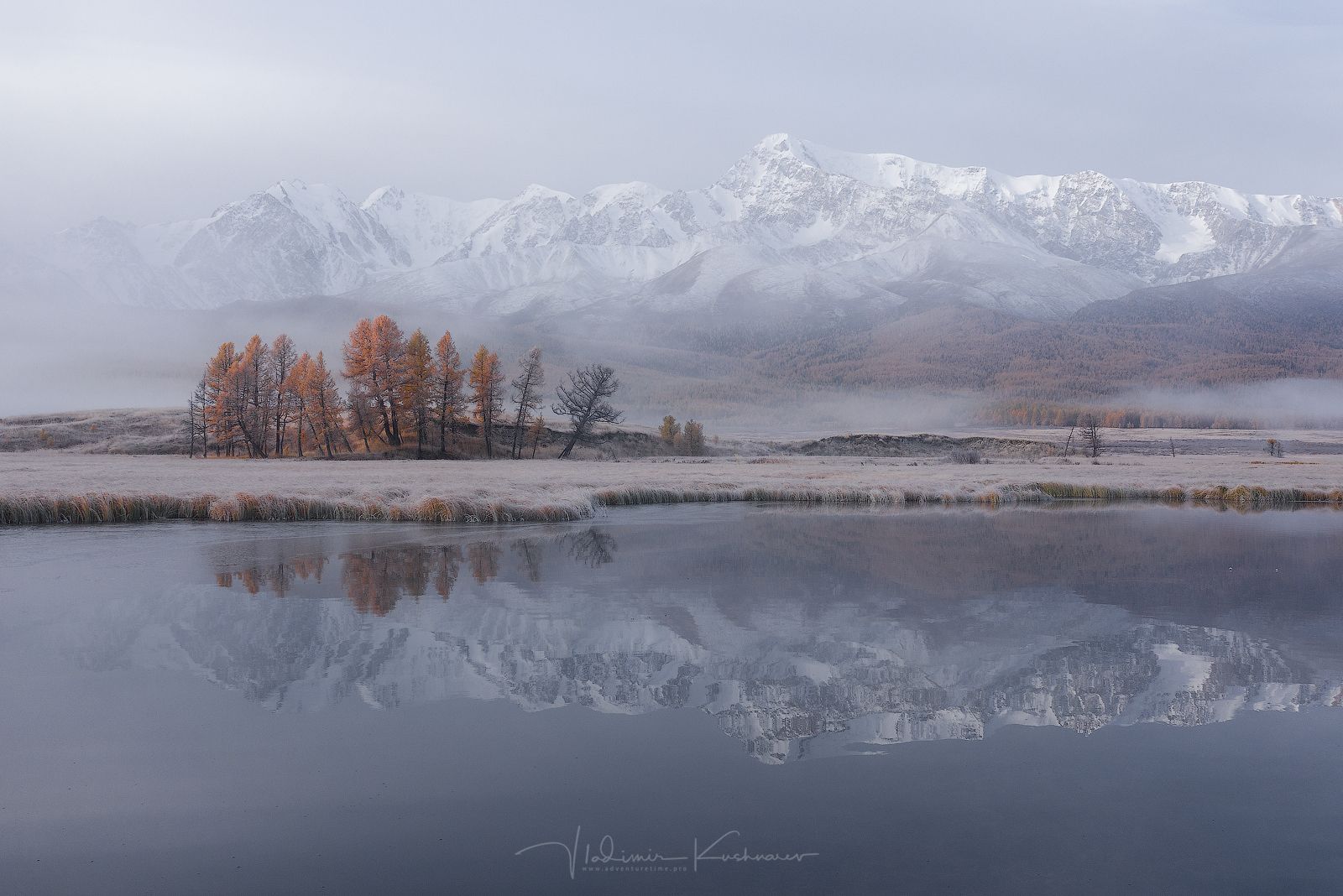 Морозное сентябрьское утро. Чтобы добраться до этого места нам пришлось форсировать 5 бродов через малые ручейки и речки. В одном из них мы потеряли передний регистрационный номер нашей машины.))))