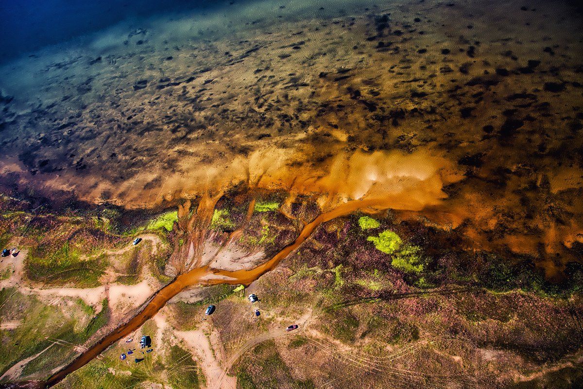 Это озеро Арахлей в Забайкальском крае. У берега отмель и очень прозрачная вода, а ручей несёт песок, который расплывается на отмели - вот и получается такой необычный эффект.