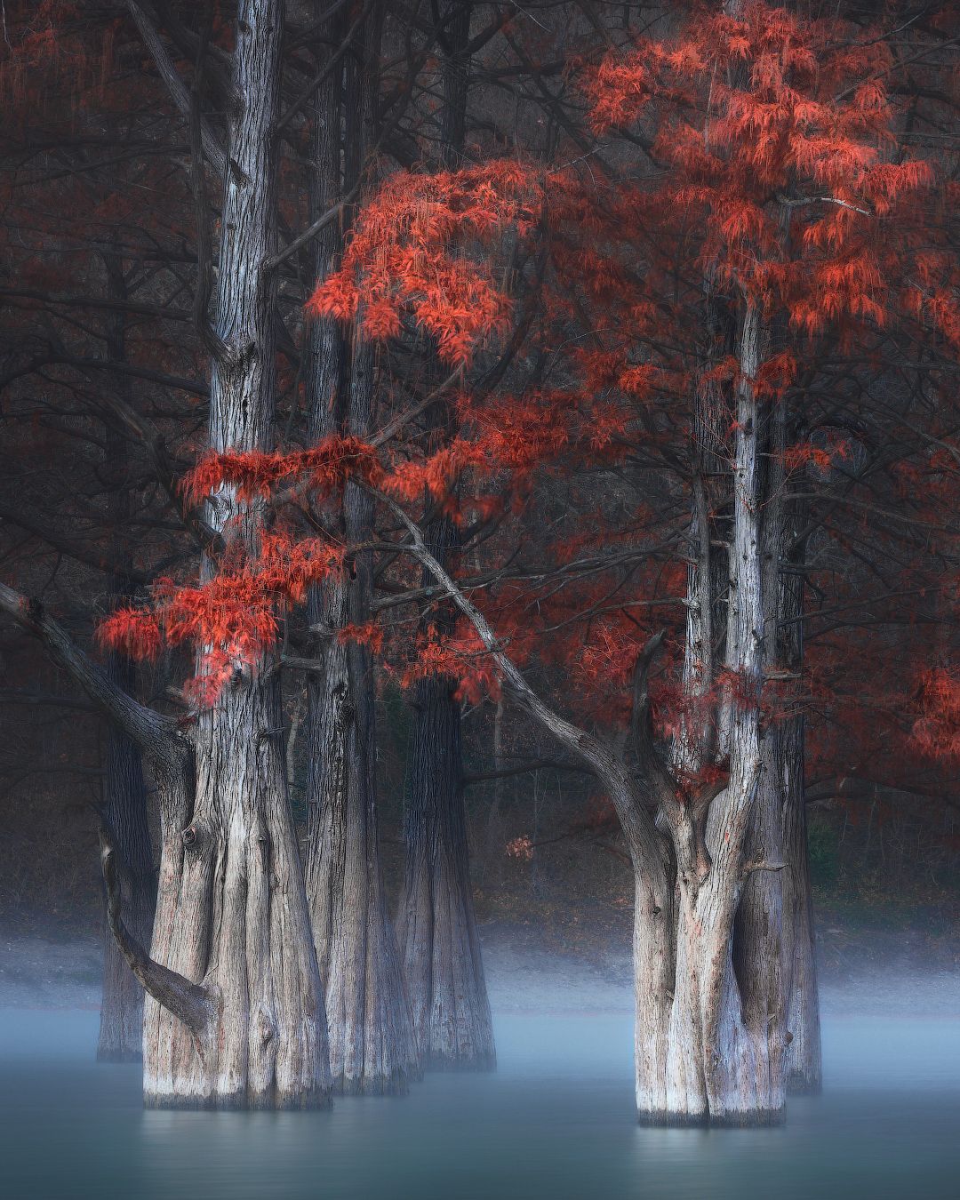 Лучше всего оказаться на озере осенью перед рассветом. В спокойную, безветренную погоду. Тогда кипарисы предстанут перед вами в тихом одиночестве туманной дымки и в праздничном осеннем наряде крон.
