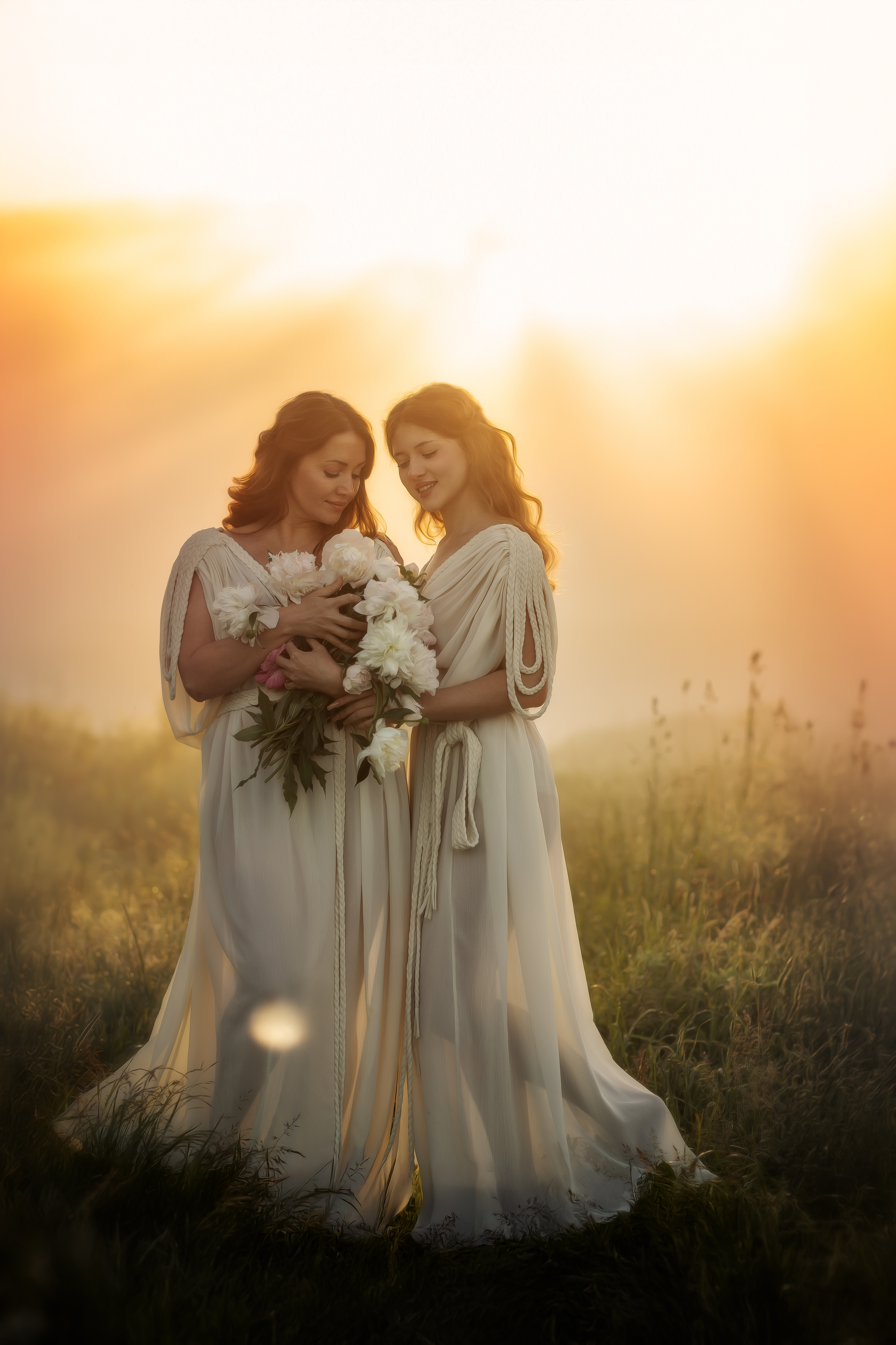 Свет — главный акцент. Он не просто освещает, а обволакивает, как тонкая пелена, придающая сцене почти ритуальный оттенок. Поза — естественна, но не случайна: объятие, наклон голов, взгляд вниз — всё говорит о внутренней связи, которую Вы умело передали без лишних слов.