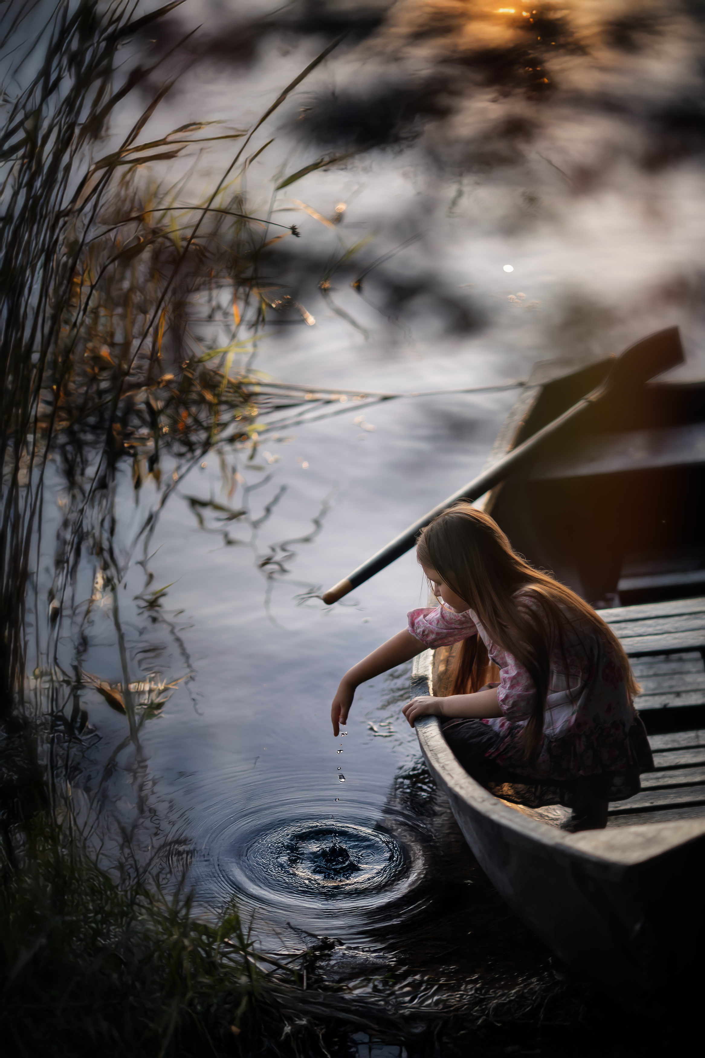 Ваш кадр — как тихий миг, застывший в воде: ребёнок, лодка, рябь, свет — всё ведёт к ощущению глубокого покоя. Свет ложится точно, акцентируя движение пальца и круги на поверхности, а фон остаётся в нежной нечёткости. Очень чисто, очень живо.