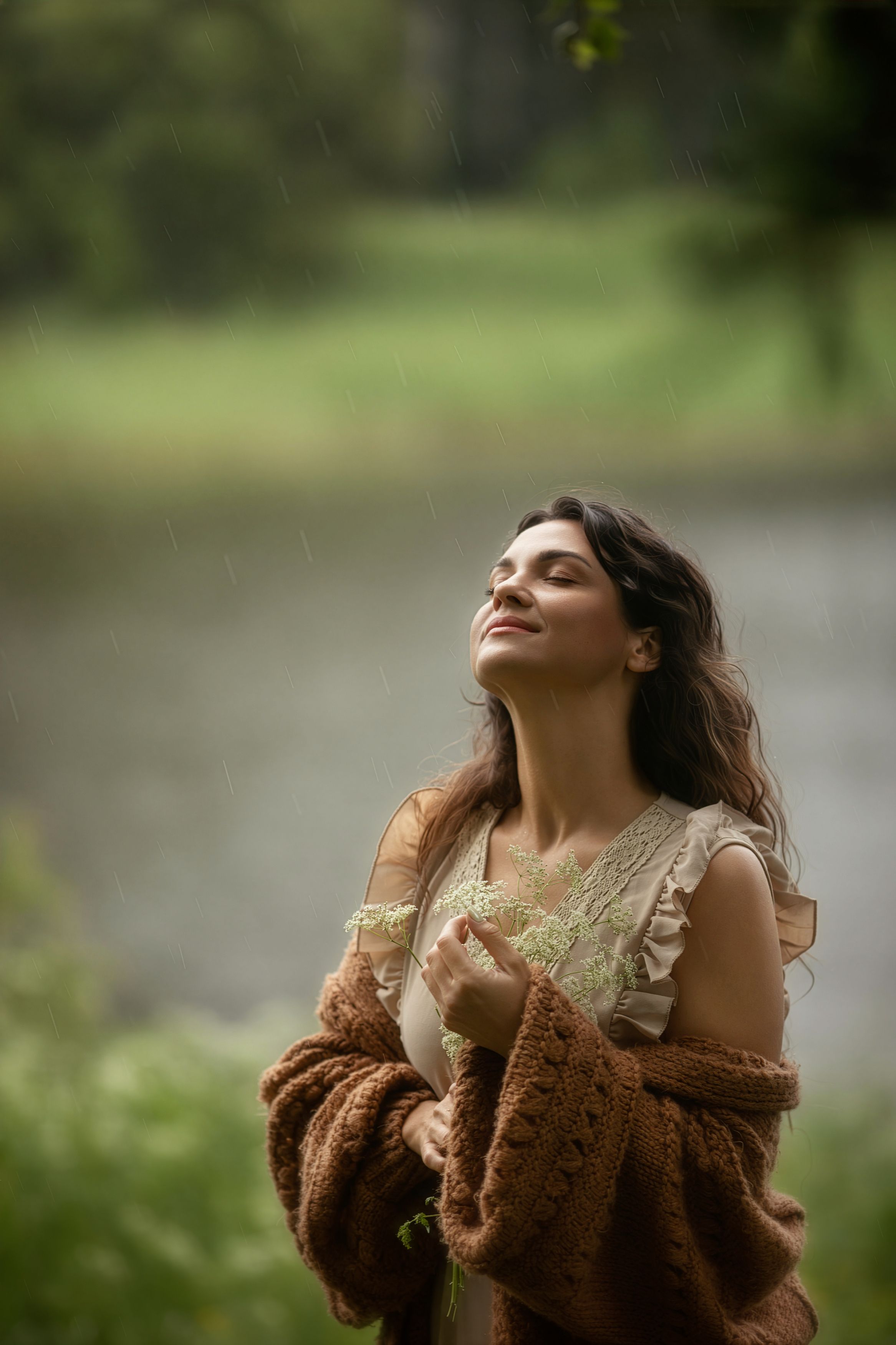 На снимке запечатлен момент глубокого созерцания — женщина стоит у озера, подставляя лицо каплям дождя. Ее поза и выражение лица передают внутреннее спокойствие и благодарность природе. Винтажный наряд с кружевом и теплым шарфом добавляет сцене ностальгическую атмосферу. Фон — размытый пейзаж с водой и зеленью — усиливает ощущение гармонии. Фотография Анны Грошиковой передает тонкую эстетику природного момента, где человек и окружающий мир сливаются в едином дыхании.