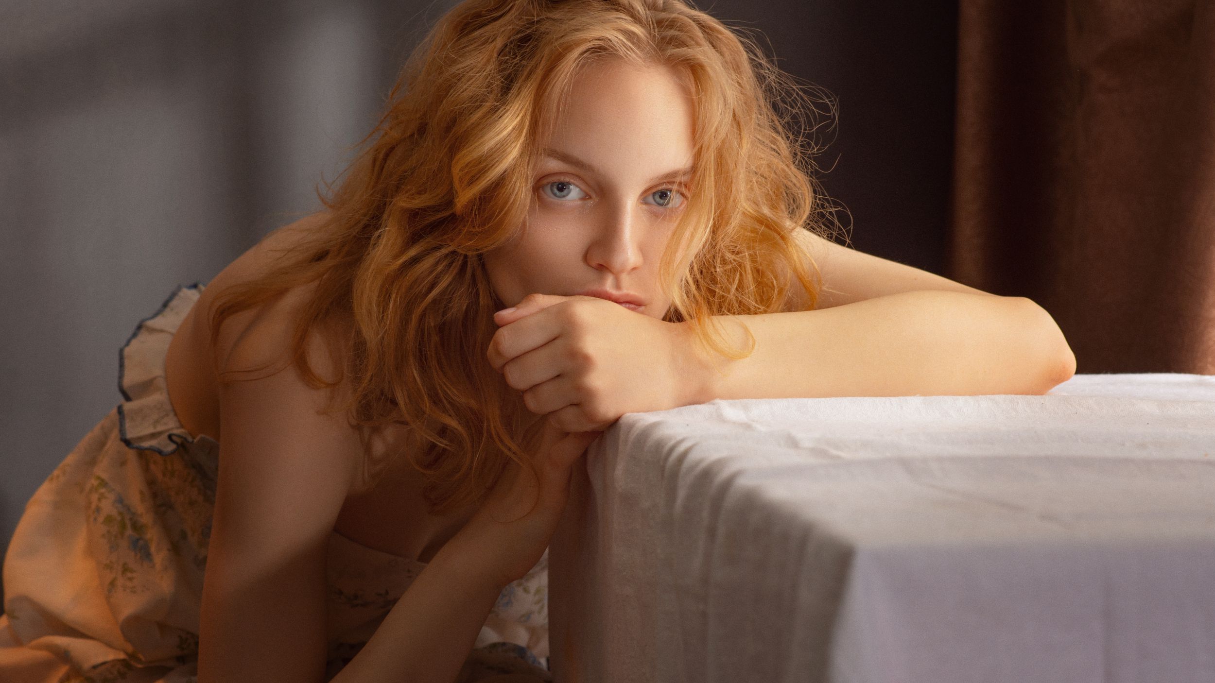 В кадре — женщина, чей взгляд пронзает пространство, будто она вглядывается в нечто скрытое за пределами кадра. Поза — напряжённая, но не агрессивная, скорее — задумчивая, почти молитвенная. Тёплый свет, мягкие тени и текстура ткани создают атмосферу интимной драмы. Это не просто портрет — это момент, застывший в сознании, где тишина говорит громче слов. Фотограф Алексей Гурылев мастерски передаёт внутреннее напряжение и глубину человеческих чувств.