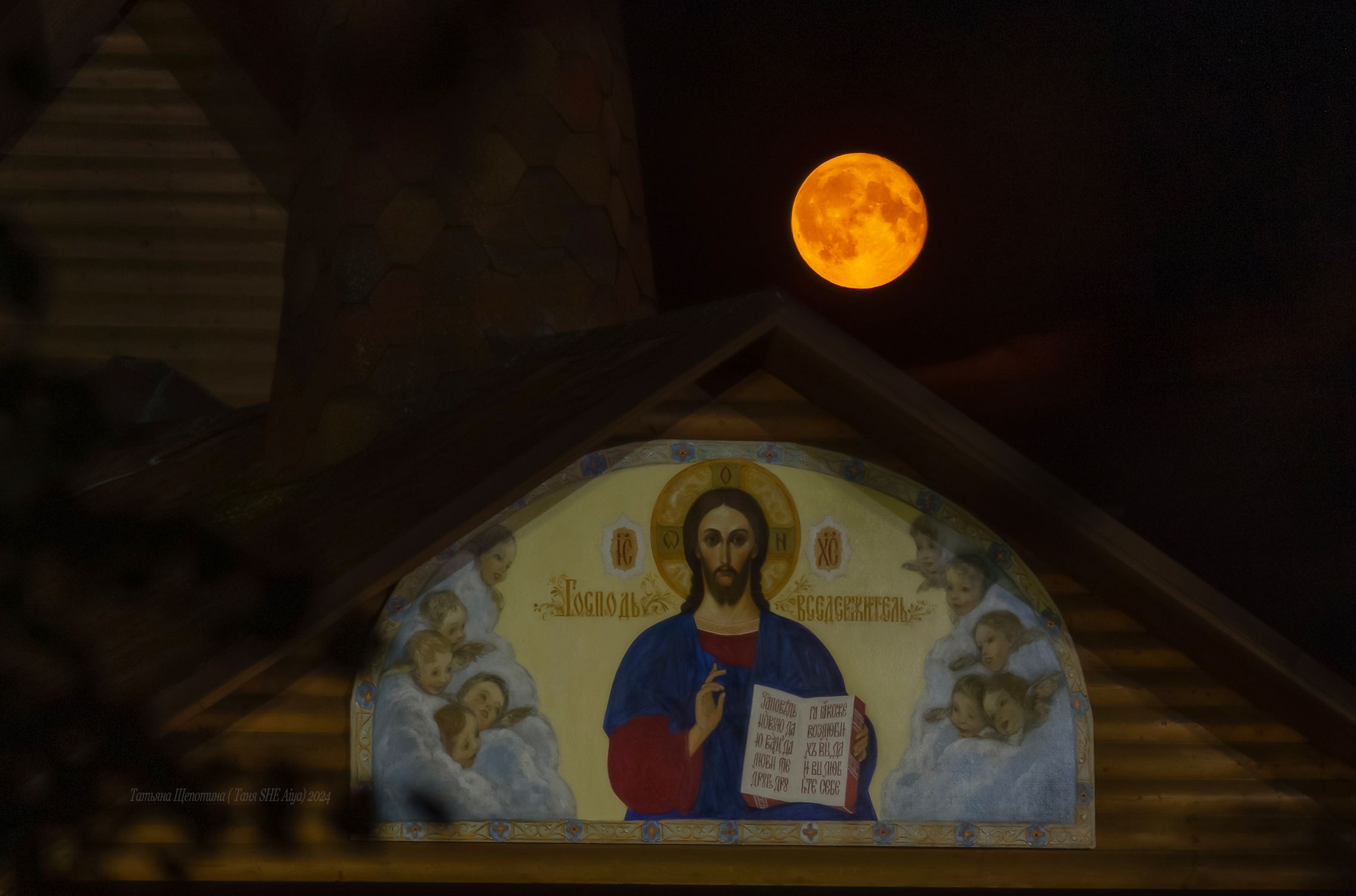 Суперлуние 19 августа 2024 года. Гуляла в полях возле дома, распугивая цапель и уток, которые на ночь устроились у речки между кукурузным полем и скошенным). Называется это Суперлуние Осетровым, но цвет вначале был невероятный! ЛОСОСЕВЫЙ! Обратно шла мимо храма Спиридона Тримифунтского, который стоит на краю этих полей...
