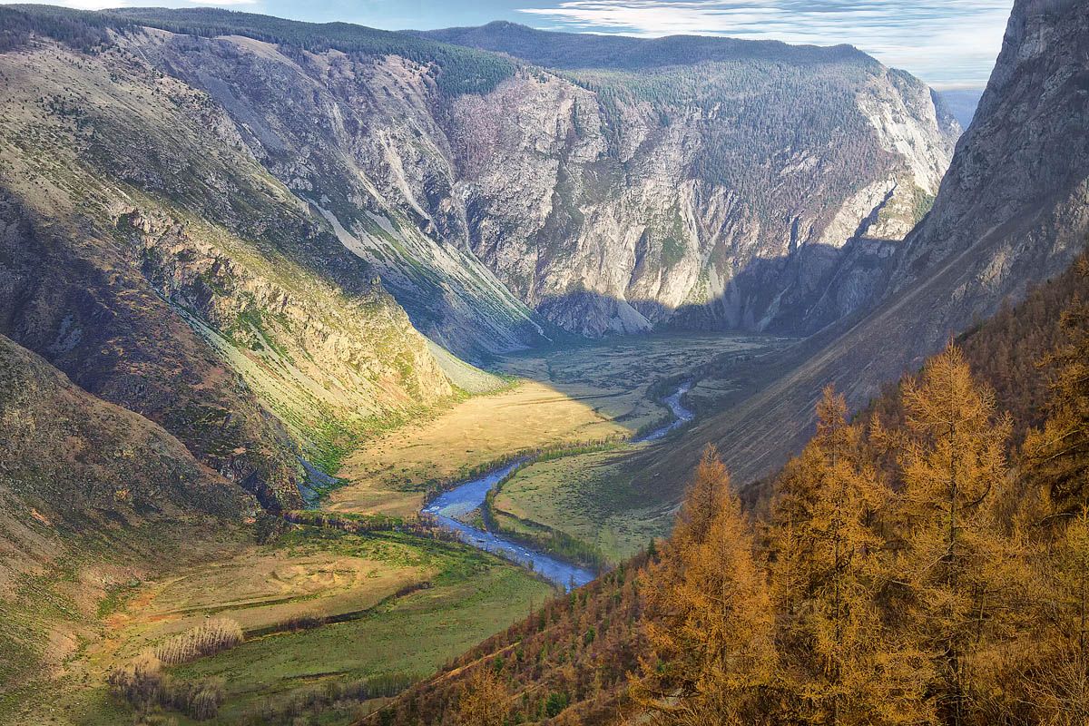 Телевик сделал свое дело - нижняя граница кадра (по дну ущелья) находится в 4-5 км от перевала. На фото место впадения реки Куркуре (с одноименным водопадом) в Чулышман. Невооруженным глазом (или вооруженным нормальным или широкоугольным объективом) это место кажется значительно дальше, а в поле зрения попадает больше элементов самого перевала, а не только склон в ПНУ, находящийся за перевалом.