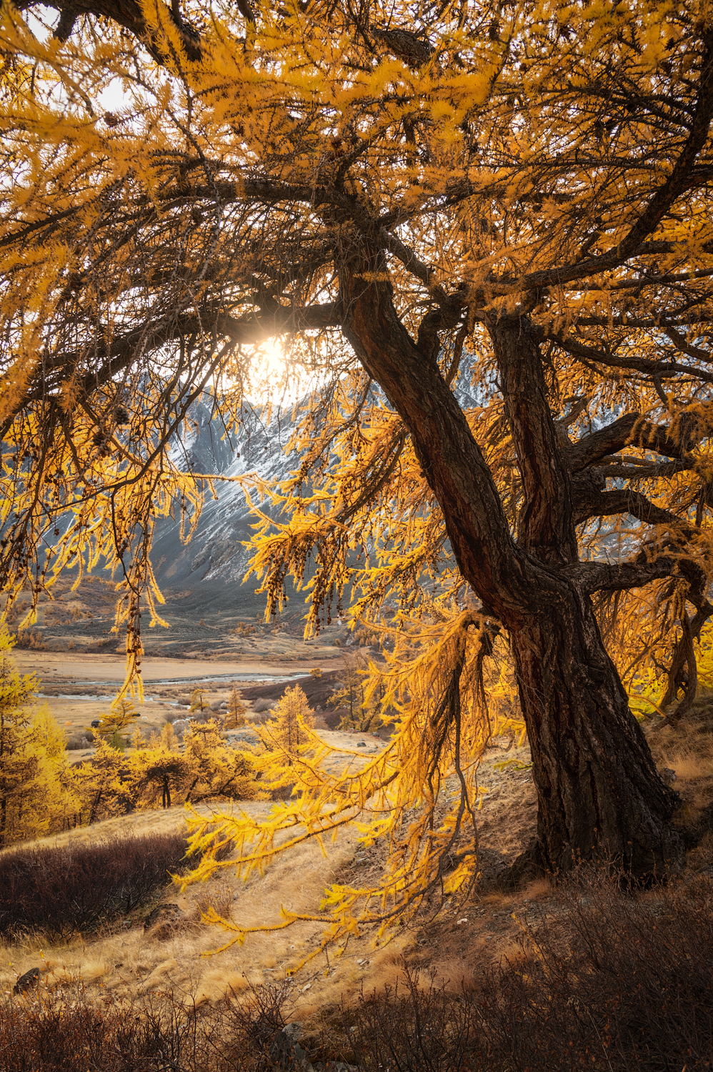 На фоне величественных гор Алтая в Кош-Агачском районе возвышается старая лиственница, чьи ветви, усыпанные золотистой хвоей, создают живописный купол. Солнечные лучи проникают сквозь крону, освещая склон и подчеркивая текстуру коры. Пейзаж передаёт спокойствие и мощь природы в золотую осень — время, когда горы и леса Алтая достигают своей самой яркой гармонии. Фотография Рубан Елена.