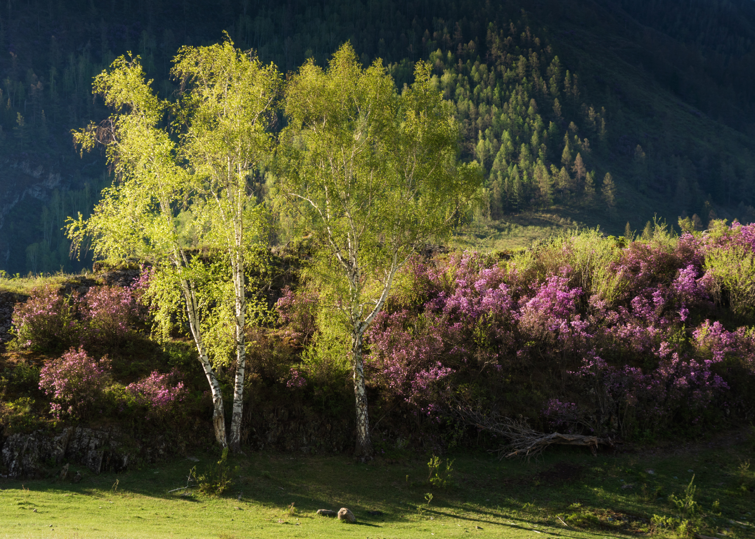 Весной Алтай пробуждается от зимнего сна и маральник по праву становится главным солистом великолепного природного спектакля. Этот полувечнозелёный кустарник цветёт дважды в год: пышно - весной, и отдельными цветками - тёплой осенью. Но те самые «розовые лавины», ради которых едут к нам туристы, - явление исключительно весеннее.