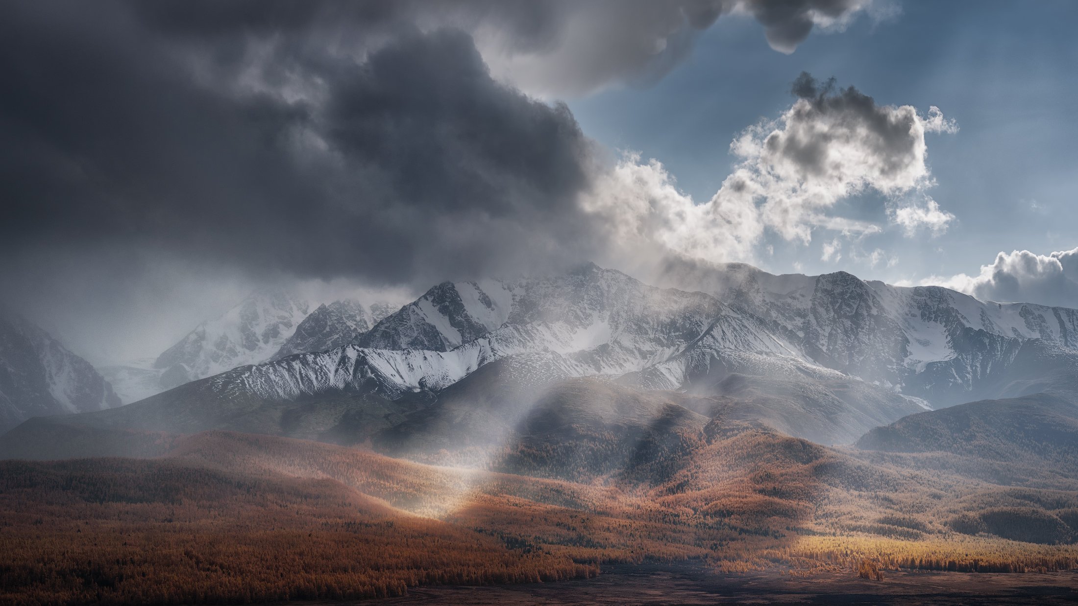 Вид с урочища Ештыкель на передовые гребни узла Биш-Иирду (Северо-Чуйский хребет) и уходящую прочь грозу. Улаганский район, Республика Алтай, сентябрь 2019