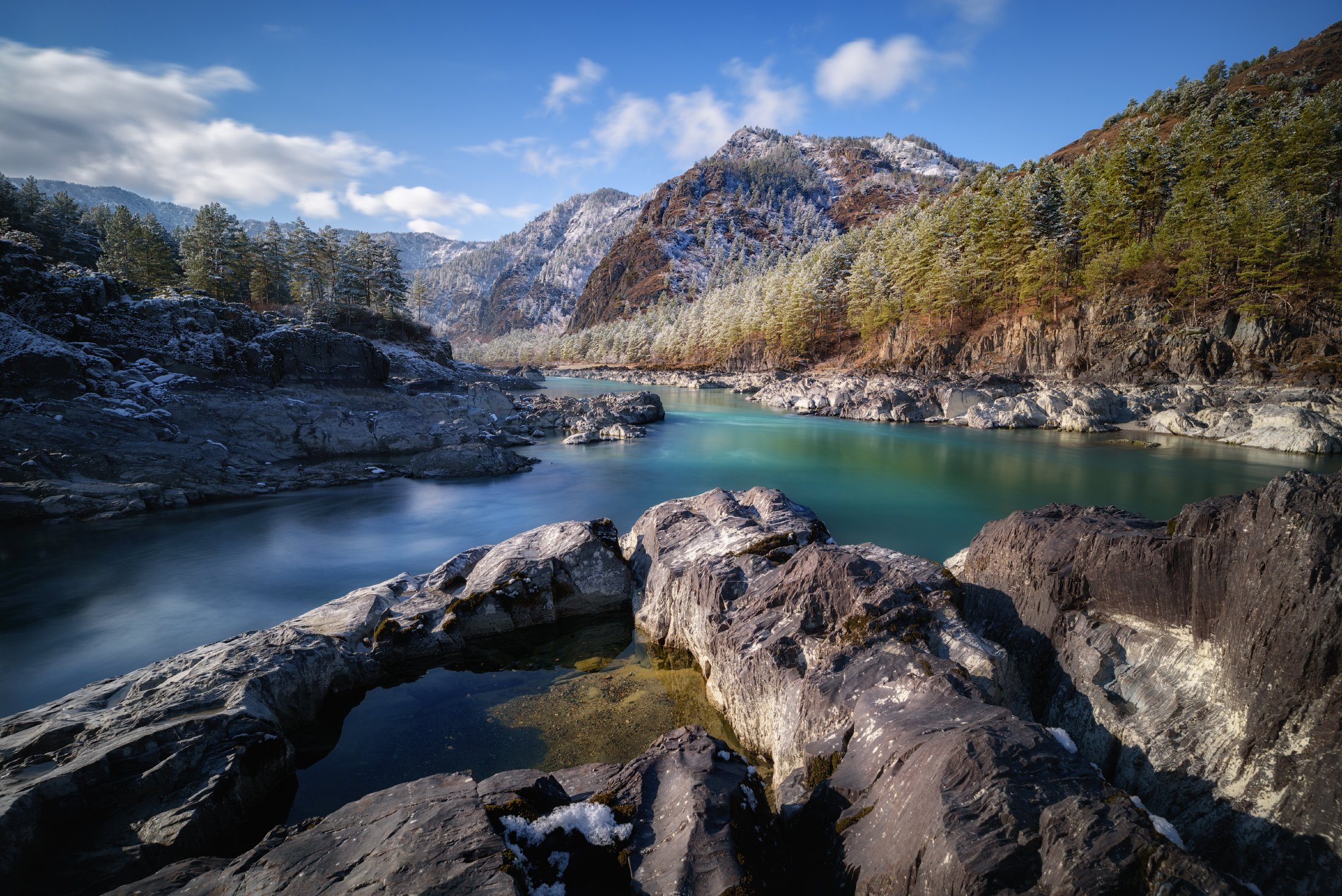 Река Катунь - одна из крупнейших рек Республики Алтай и искусный резчик по совместительству. На снимке она кажется ласковой и шелковой, но это в немалой степени обман, ведь именно бурные воды Катуни неистово высекали самые разные формы на горных породах, веками создавая причудливые углубления и проявляя рисунок камня, и пример тому виден на переднем плане этого снимка. Снимок сделан 3 ноября, неподалеку от села Чемал, ночью здесь выпал первый снег, припорошивший сахарной пудрой горный пейзаж.