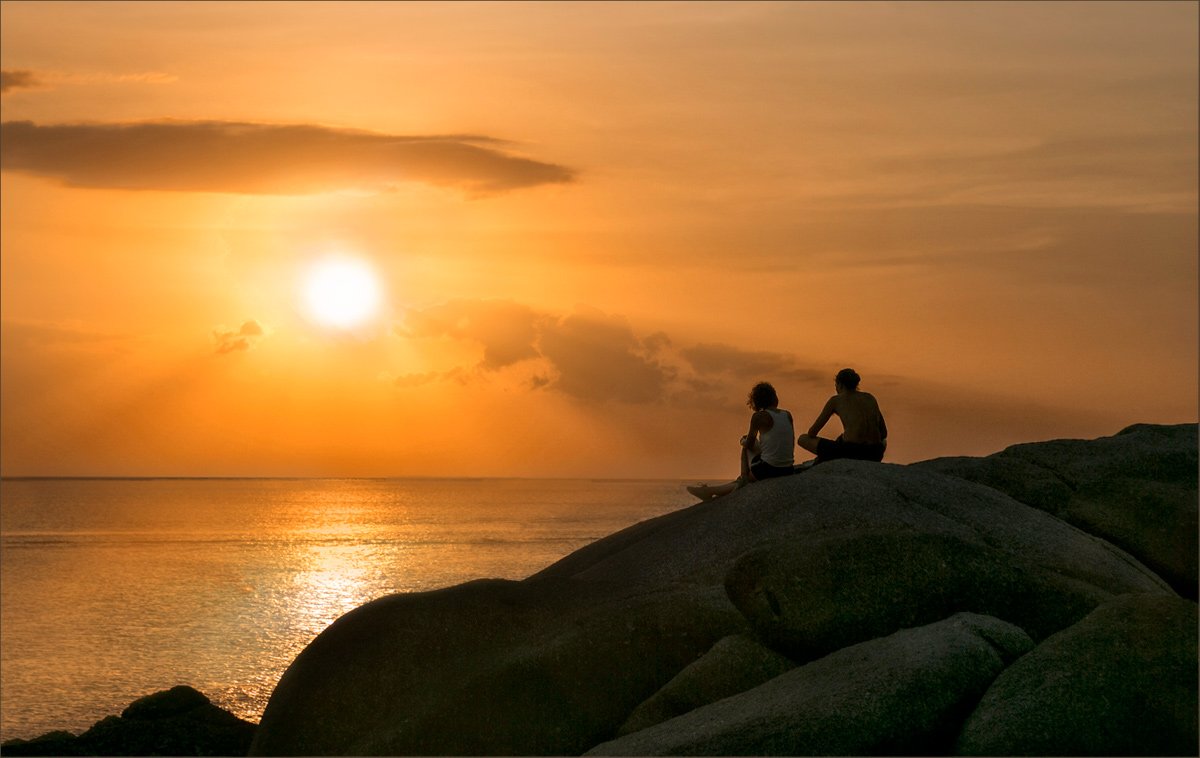 Я бы повернул фото так, чтобы взгляд был слева направо от людей к солнцу. Так для восприятия привычнее так, как мы читаем, пишем слева направо (ИМХО)