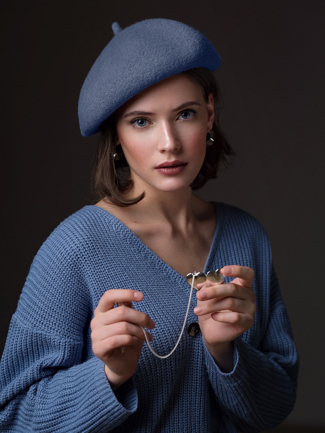 В кадре — портрет молодой женщины, чья поза и выражение лица передают глубокую внутреннюю задумчивость. Синий берет и свитер создают гармоничный образ, подчёркивающий утончённость и спокойную силу. Держа в руках цепочку, она словно вспоминает что-то важное. Фотография — это не просто снимок, а момент, застывший во времени, наполненный эмоциональной глубиной.