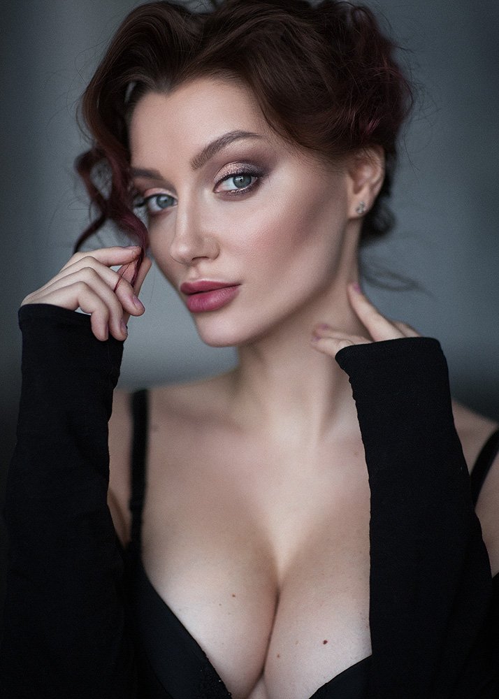 Фотография передает атмосферу тонкой чувственности и внутренней уверенности. Женщина в черном наряде с глубоким вырезом, с легким макияжем и утонченной прической, смотрит прямо в камеру — взгляд пронзительный, но спокойный. Свет мягко моделирует черты лица, подчеркивая изящество шеи и линии плеч. Это не просто портрет — это повествование о силе, сдержанности и женской грации. Работа Алексея Казанцева демонстрирует мастерство в создании образа, где каждая деталь — часть целостной гармонии.