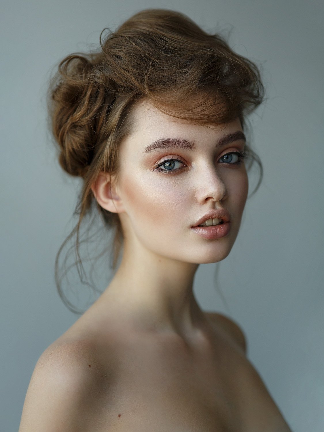 Портрет молодой женщины, снятый в мягком, естественном свете, передаёт тонкую эмоциональную атмосферу. Выразительный взгляд, небрежно уложенные волосы и безупречная кожа создают ощущение живой, незащищённой красоты. Фотография акцентирует внимание на деталях лица и игре света, подчёркивая индивидуальность модели. Работа отражает тонкое мастерство в портретной съёмке, где каждая деталь — часть целостного образа.