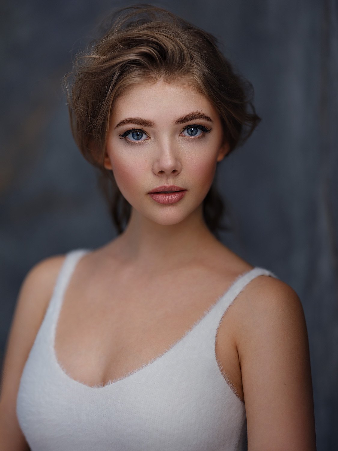 Фотограф Алексей Казанцев запечатлел Наталью в атмосфере спокойной элегантности. Её взгляд, полный внутреннего света, и лёгкий образ в белом топе создают ощущение чистоты и гармонии. Снимок — это не просто портрет, а отражение тонкой женственности, где каждая деталь подчёркивает естественную красоту модели. Свет и композиция работают как единое целое, передавая тёплую, почти поэтическую атмосферу.