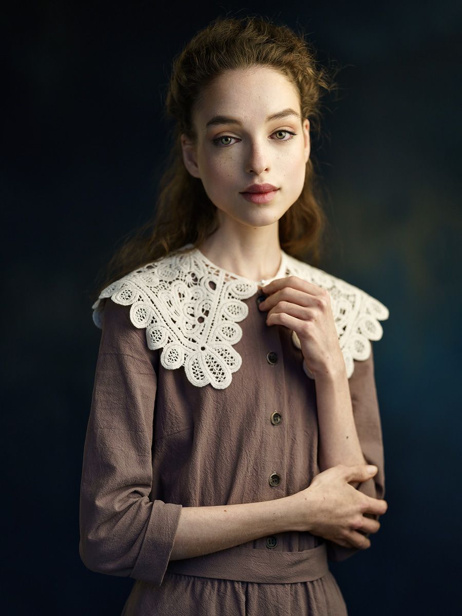 На этом снимке из серии Lера фотограф Алексей Казанцев создает атмосферу утонченной классики. Молодая женщина с мягким взглядом одета в коричневое платье, украшенное крупным белым кружевным воротником, что отсылает к стилю прошлого века. Темный фон подчеркивает детали одежды и черты лица модели, создавая интимную и драматичную композицию.