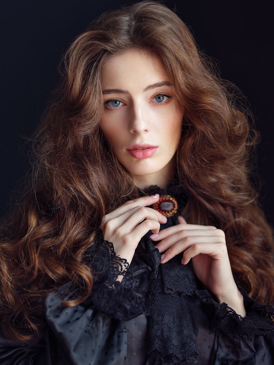 Портрет молодой женщины с выразительными синими глазами и обильными вьющимися волосами, одетой в тёмное кружевное платье. Её поза — спокойная, почти задумчивая, руки слегка прикасаются к воротнику. Свет акцентирует черты лица, создавая контраст с тёмным фоном. Фотография передаёт ощущение внутренней глубины и тонкой элегантности, не прибегая к драматизму. Работа Алексея Казанцева.